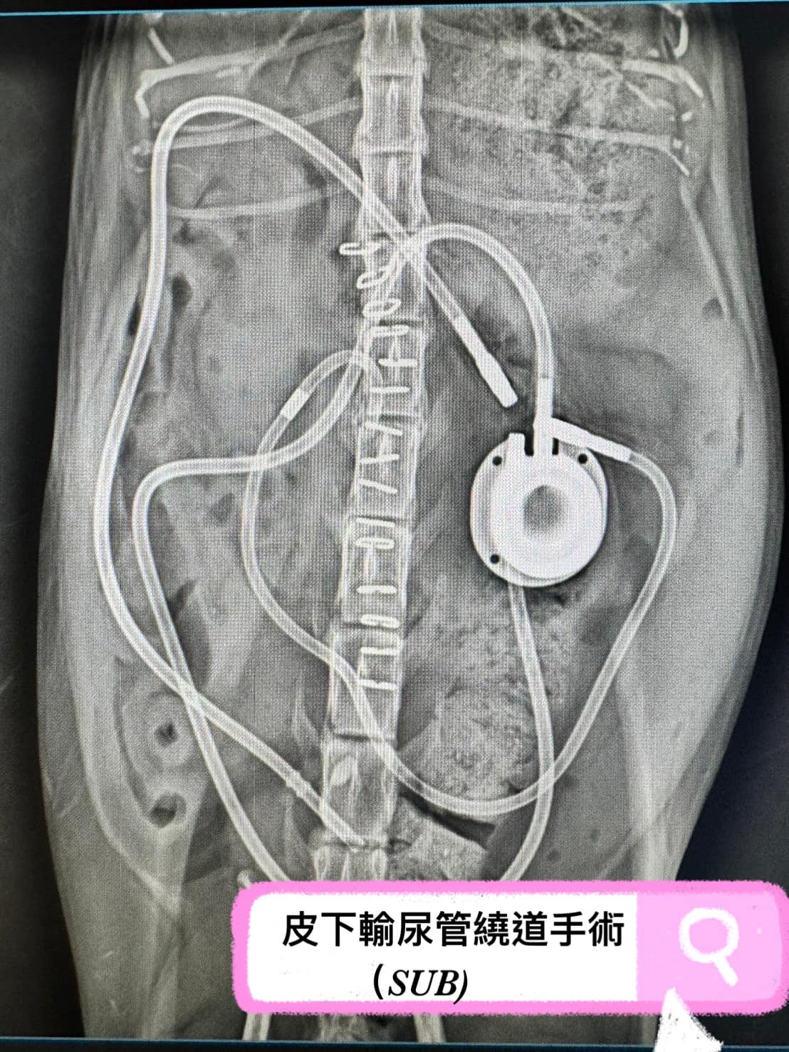 貴賓QQ最近有滴尿或血尿的情況,就診當天更是頻繁蹲尿,但尿不太出來,經由超音波、X光檢查後,發現有膀胱/尿道結石。尿道結石就是膀胱結石滑入尿道,阻塞尿尿的路徑,就像水管賭塞一樣,時間久了膀胱就會持續脹大,有可能會導致膀胱破裂、尿腹、腹膜炎,嚴重會危及生命!