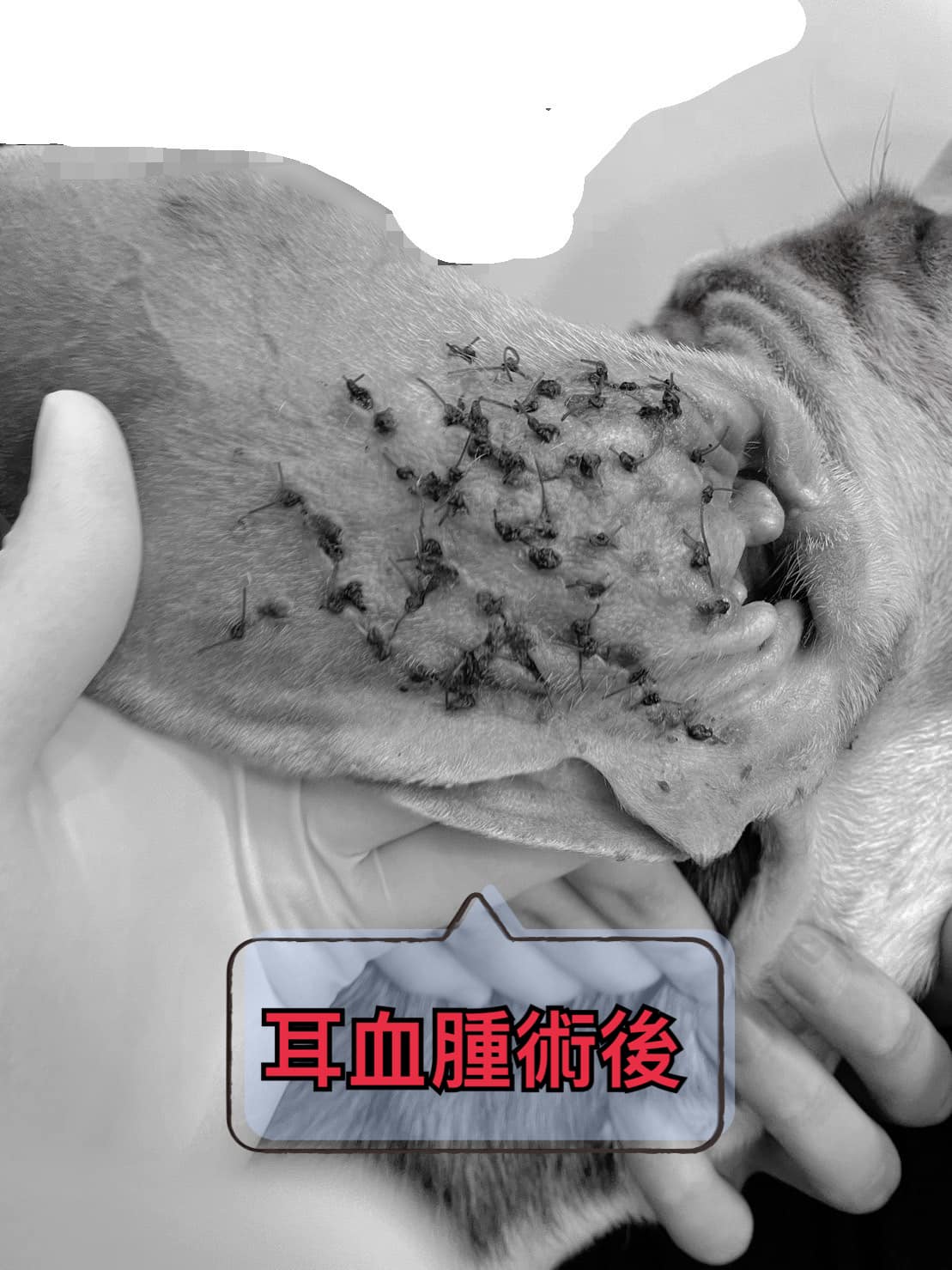 住院時每天內外夾攻,耳藥治療耳內酵母菌感染,同時包紮固定促進消腫癒合。