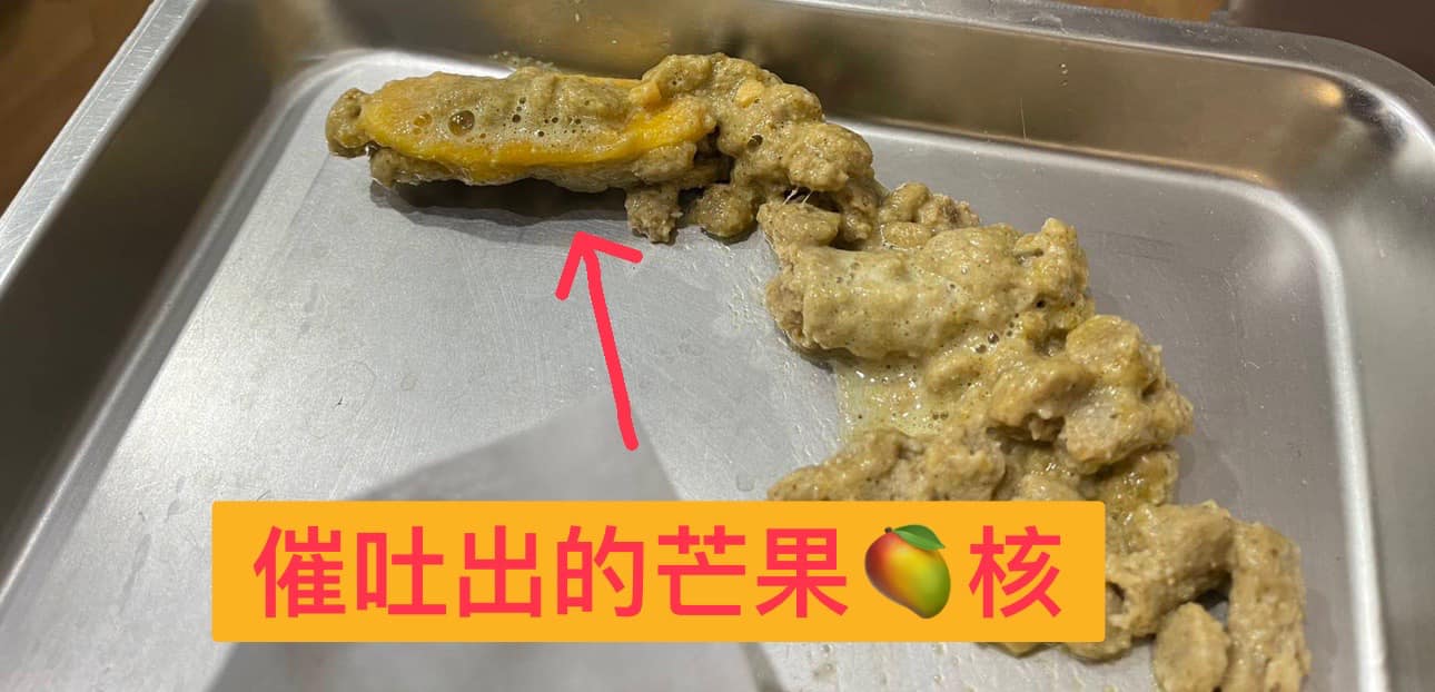 幸運的是給了催吐劑後,10分鐘內阿尼就自行把芒果籽吐出來了