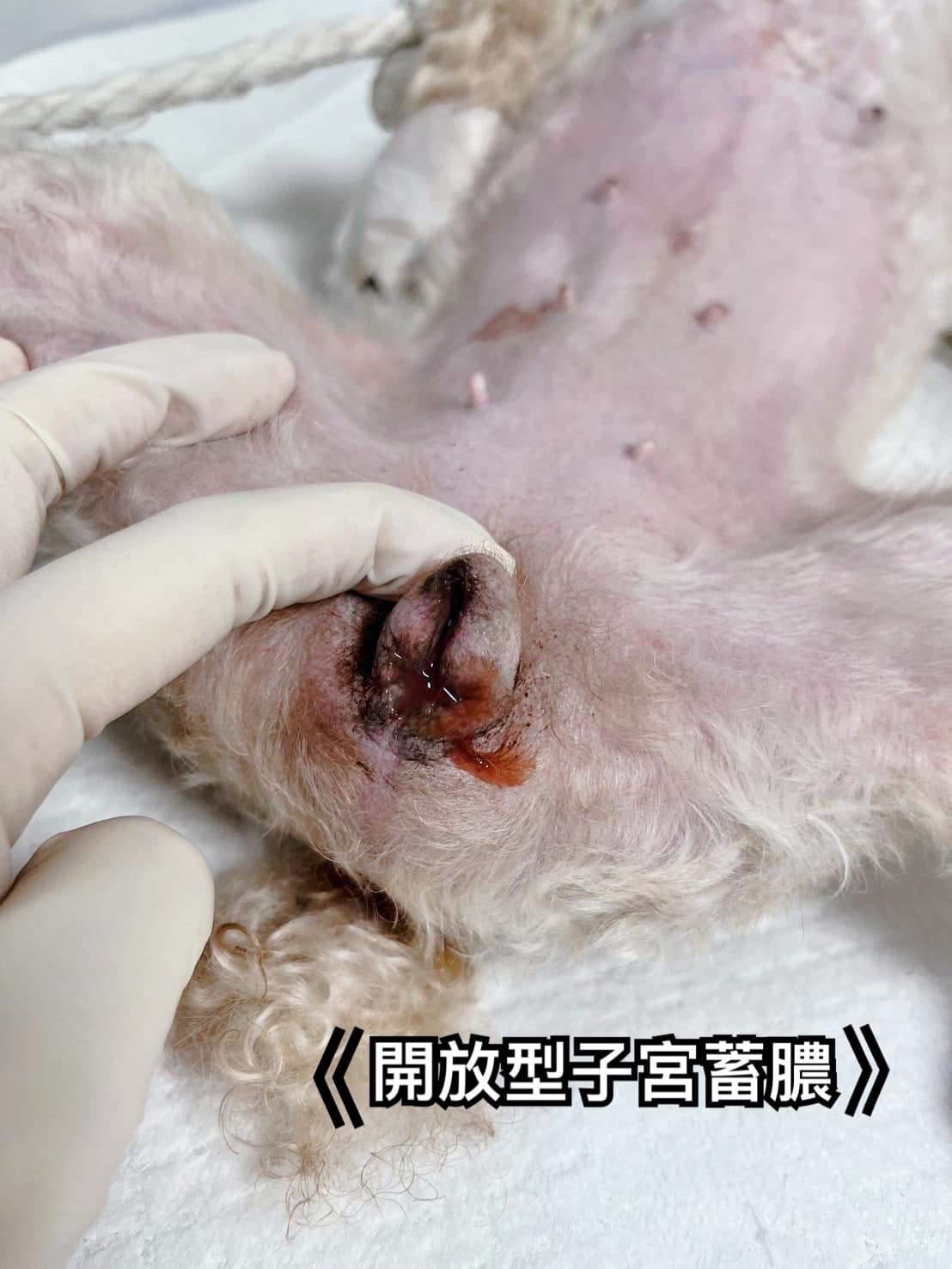 多年前被飼主從繁殖場救援出來的年老八哥犬妹妹,一年前曾經因為子宮蓄膿在外院做過手術本次就醫主要是因為妹妹再次發生相似症狀且外陰部持續流出深色分泌物。