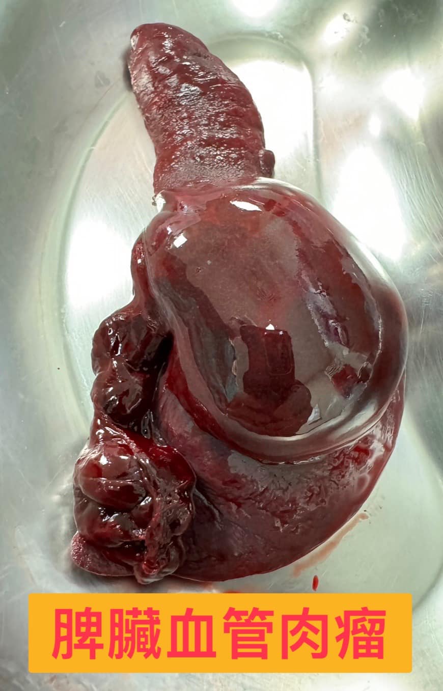 迅速找出問題所在,有一顆 #脾臟腫瘤 和大量腹水,腹水抽出來是血色的液體,初步判斷為