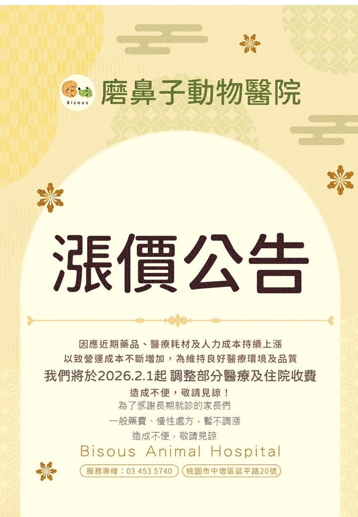 最新消息 首頁 最新消息 2026-01-27 春節公告 MORE 2026-01-27 價格調整 MORE 2025-05-07 夜間急診服務調整公告 MORE 2023-09-01 2月醫師班表 MORE 2021-10-21 住院及探病須知 MORE 2021-08-26 超音波升級囉! 新機入荷~ Canon超音波影像診斷裝置 - Aplio 300 大傢伙入院服務囉~毛孩福音!! MORE 2020-05-21 X光升級囉! MORE 2020-05-04 急診須知及檢傷分類 MORE «1»